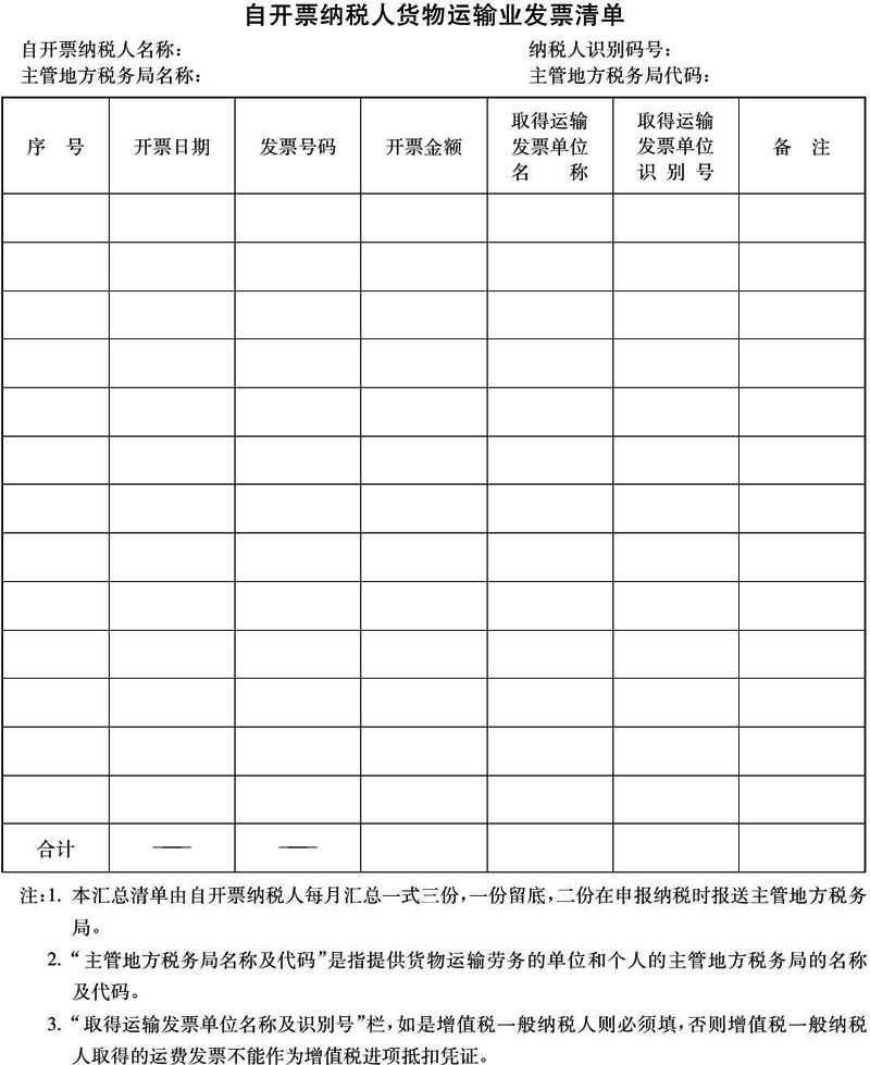 三、从2003年12月1日起经地方税务局认定的自开票纳税人在申报缴纳营业税时应向主管地方税务局报送《自开票纳税人货物运输发票清单》纸制文件和电子信息。