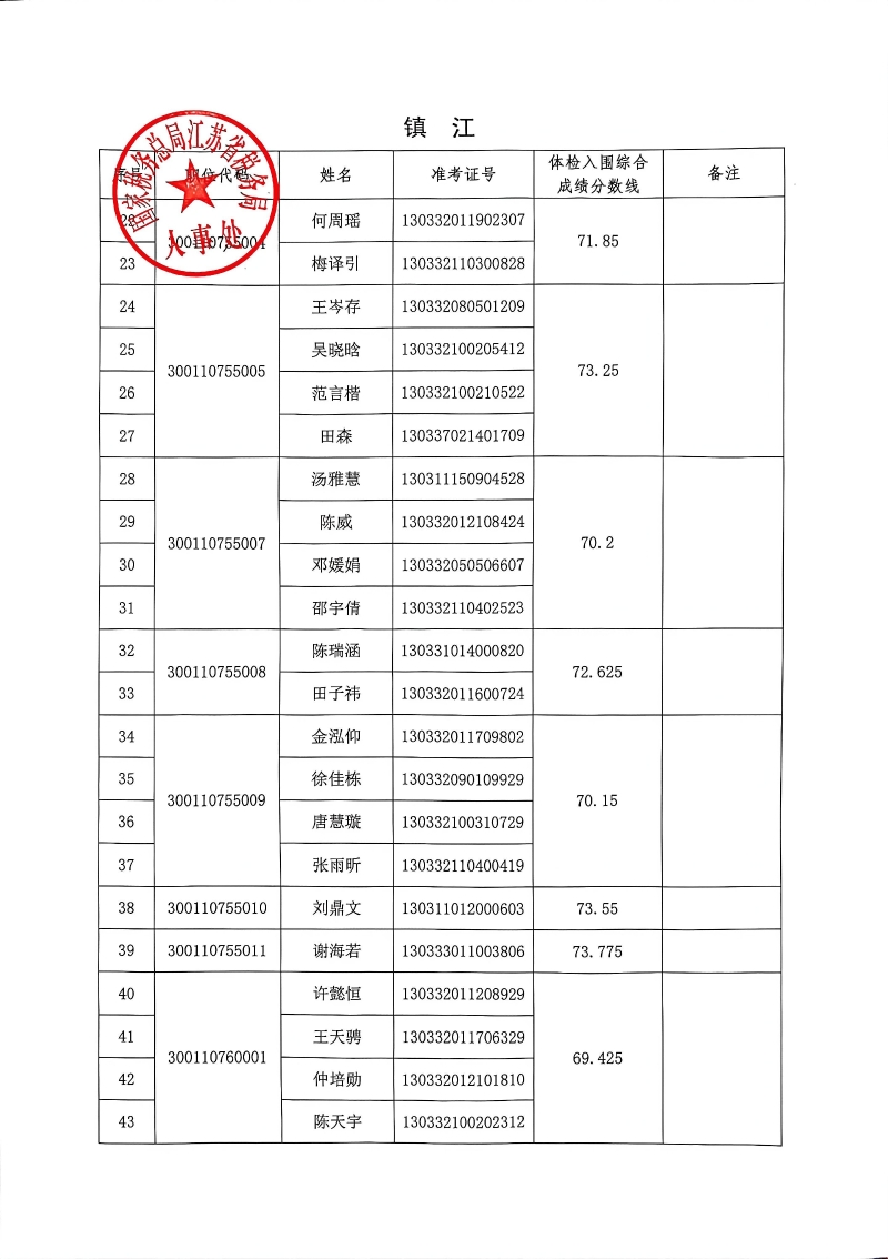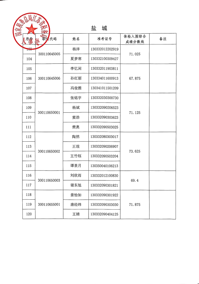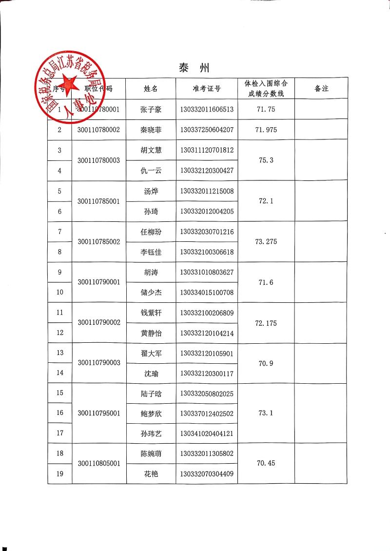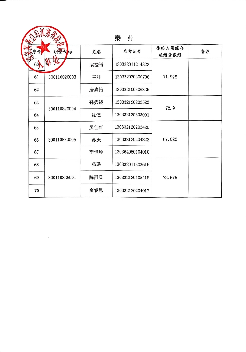国家税务总局江苏省税务局2026年度考试录用公务员3月17日体检入围人员名单