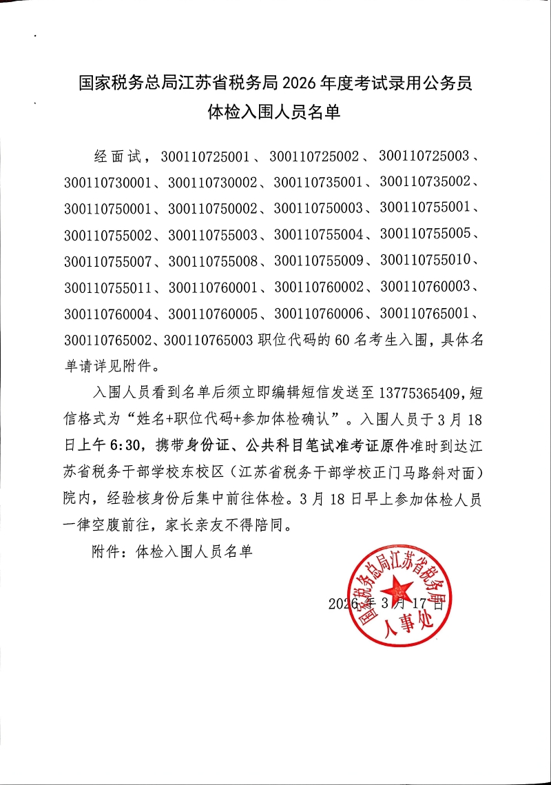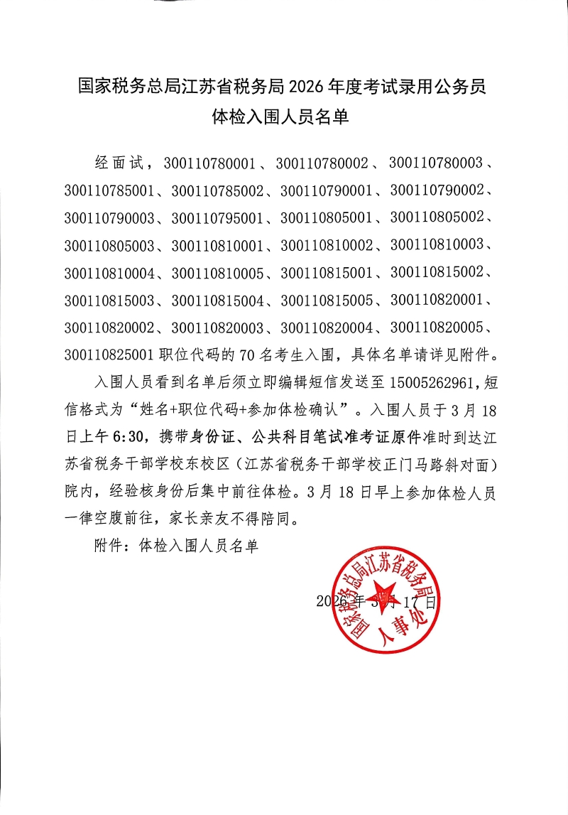 国家税务总局江苏省税务局2026年度考试录用公务员3月17日体检入围人员名单公布如下,请体检入围人员认真阅读注意事项。