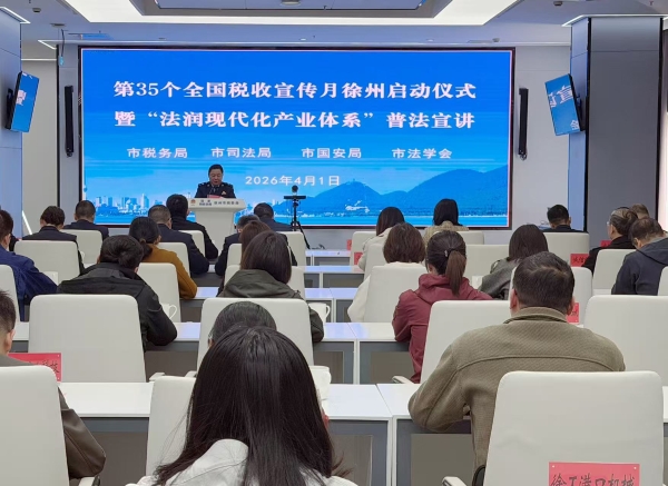 4月1日上午,我局联合市司法局、安全局、法学会举行第35个全国税收宣传月徐州启动仪式暨“法润现代化产业体系”普法宣讲,标志着以“税收·法治·公平”为主题的税收宣传月活动拉开序幕。市税务局、市司法局、市国安局、市法学会有关领导和部门负责人,49名工程机械产业纳税人代表、新闻媒体记者、各县(市、区)税务局相关人员及400多名企业财务人员现场或通过视频参加启动仪式。