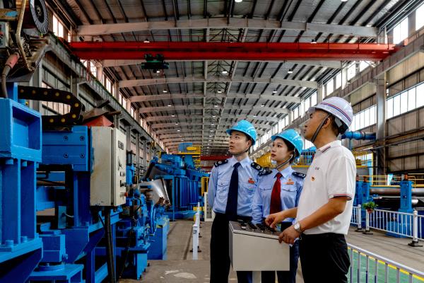 近日,国家税务总局江苏常州经济开发区税务局“经税先锋”党员服务队走访企业,宣传讲解相关税费政策,帮助企业防范涉税风险。图为“经税先锋”党员服务队成员在常州新华昌国际集装箱有限公司了解生产经营情况。