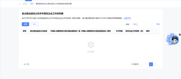 点击【新增】,填写“自主就业退役士兵姓名”“《中国人民解放军义务兵退出现役证》或《中国人民解放军士官退出现役证》编号”“工作年度”“在本企业工作时间(月)”