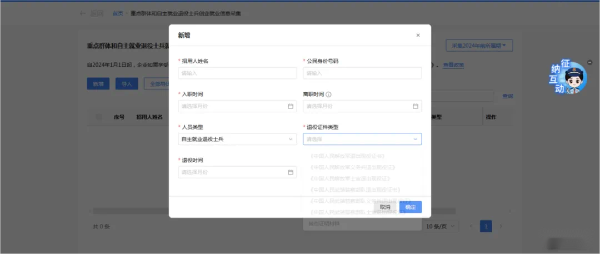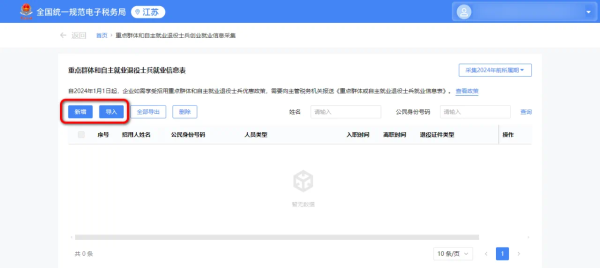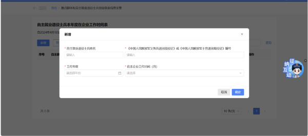 点击【新增】,填写“招用人姓名”“公民身份号码”“入职时间”“离职时间”“人员类型”若人员类型为“自主就业退役士兵”,还需选择“退役证件类型”,填写“退役时间”。